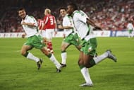 BASEL, SWITZERLAND – SEPTEMBER 8: Clinton Morrison and Roy Keane celebrate a goal during the FIFA World Cup 2006 Group Four qualifying match between Switzerland and Republic of Ireland at The St. Jakob Stadium on September 8, 2004 in Basel, Switzerland.