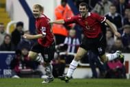 WEST BROMWICH, ENGLAND – NOVEMBER 27: Paul Scholes of Manchester United celebrates his first goal with team mate Roy Keane, during the Barclays Premiership match between West Bromwich Albion and Manchester United at the Hawthorns Stadium, on November 27, 2004 in West Bromwich, England.
