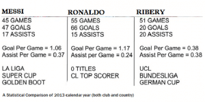 Messiβs claim to the award can be understood by taking the entire period of 2012-2013 rather than just the recent turn of events into consideration. With his 46 goals in the 2012/13 campaign, Lionel Messi went on to claim the European Golden Shoe for the third time, becoming the first player in history to do so. In the Champions league, he is just six shy of Raulβs tally of 71 to become the leading goal scorer of all time. The 2012-13 season saw the diminutive Argentine scoring 60 goals and providing 16 assists in 50 appearances including all club competitions as compared to Ronaldoβs figures of 55 goals and 12 assists in 55 appearances.