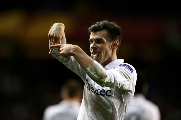 Gareth Bale of Spurs celebrates after scoring his team’s match winning second goal from a free kick during the UEFA Europa League round of 32 first leg match between Tottenham Hotspur and Olympique Lyonnais at White Hart Lane on February 14, 2013 in London, England. Tottenham Hotspur won 2-1.