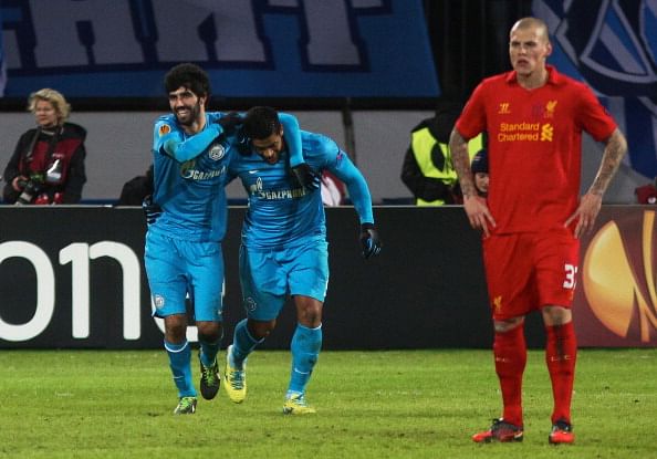 Hulk of FC Zenit celebrates a goal as Liverpool’s Martin Skrtel looks on during UEFA Europa League Round of 32 first leg match at the ‘Petrovski’ stadium on February 14, 2013 in St. Petersburg, Russia. Zenit won 2-0.