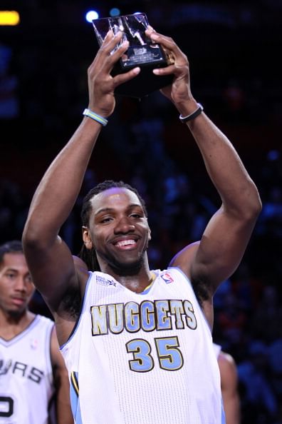 Kenneth Faried #35 of the Denver Nuggets and Team Chuck holds up the MVP trophy after the BBVA Rising Stars Challenge 2013 part of the 2013 NBA All-Star Weekend at the Toyota Center on February 15, 2013 in Houston, Texas after he dropped 40 points to lead Team Chuck to a 163 – 135 win over Team Shaq.