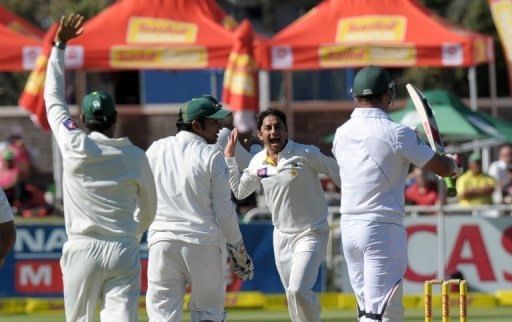 Saeed Ajmal (centre) celebrates the wicket of Jacques Kallis in Cape Town today. Off-spinner Saeed Ajmal took all five wickets as Pakistan finished on top on the second day of the second Test against South Africa at Newlands on Friday. South Africa were struggling at 139 for five at the close, still 199 runs behind Pakistan’s first innings of 338 as Ajmal took five for 41.