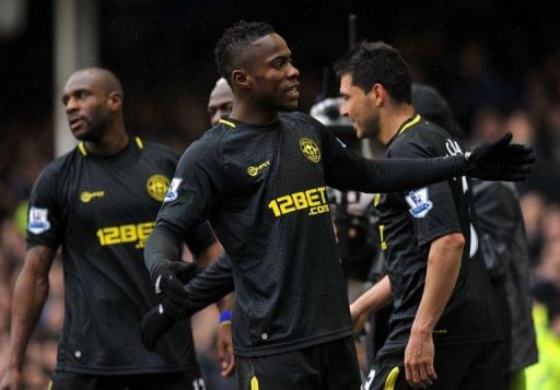 Wigan Athletic defender Maynor Figueroa (centre) celebrates a goal during the English FA Cup quarter-final football match against Everton in Liverpool on March 9, 2013. Wigan made history as the Premier League strugglers enjoyed a surprise 3-0 win against Everton to reach the FA Cup semi-finals for the first time.
