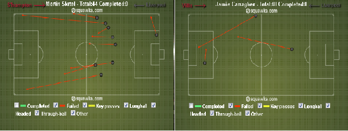 Skrtel completed only 35 of his 44 passes with maximum number of failures in tose attempted forward. Carragher whereas completed 37 of 40. Credits: www.squawka.com