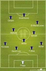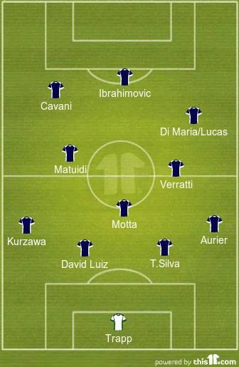 Thiago Silva and David Luiz stay back along with Motta tucking in between them to form a back three. The fullbacks push high up the pitch to combine with front three as both wingers tuck into the centre (mentioned above). Providing width while on the attack, totally depends on the fullbacks and they always remain an outlet for crosses from the wings into the danger area to connect with Ibrahimovic and Cavani, being the serious aerial threats they are.