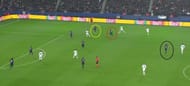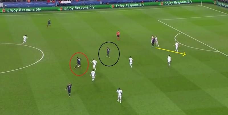 While the attack is through the centre, the midfield trio stays compact and denies any space for the opposition to be able to penetrate through the middle. As the trio becomes more compact, the wingers then go a bit wider than their original positions for minimum protection. This forces the opposition to go out wide to try unlocking PSG’s defense while once the ball goes out wide, the full backs are again supported by their corresponding central midfielders.