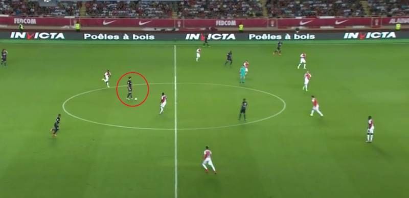 The above picture is from the game against Monaco where the Parisians triumphed 0-3 and this shows how Ibrahimovic drops deep to help the central midfielders as the Swede completed a staggering 65 passes at a pass completion rate of 89%. Note that these are figures similar to that of players like Sergio Busquets, Toni Kroos or say, Xabi Alonso.