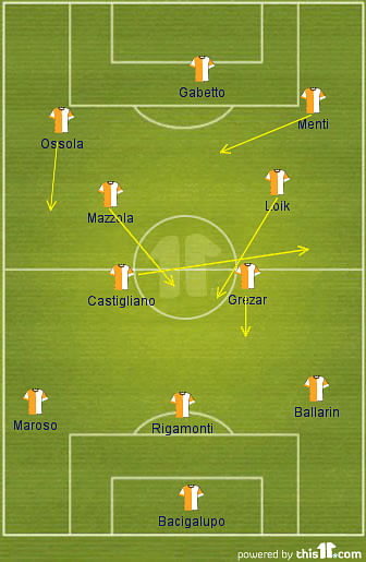The 3-4-3 often turned into a 4-4-2 and vice versa. As it is seen, Grezer, the enforcer, often dropped back at center half alongside Rigamonti, to form a 4 man backline. Mazzola would switch positions from the Inside Left channel to Central Midfield to slot in alongside Loik. Castigliano, the deep lying playmaker, would switch positions to the right flank, and Menti, the right wing forward, would move centrally to play behind the prolific hitman, Gabbetto. To simplify matters, here is an arrow board which depicts all movement: