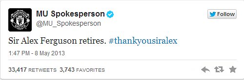 In the first hour following the official announcement of the news of Ferguson’s retirement, there were 1.4 million mentions of the story. The original tweet by the official MUFC Spokesperson’s twitter account was retweeted 18,000 times. The official hashtag for the announcement #thankyousiralex was used more than a million times in the first hour itself after the news broke out.