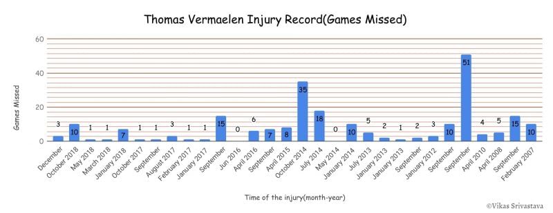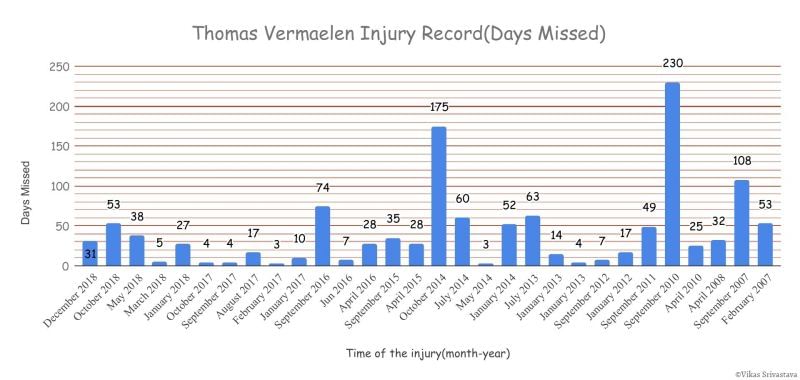 Vermaelen played only five games for Arsenal in 2010-11. He was on the sidelines for more than a third of his final four years in North London. He played only once in his debut season in La Liga and made six starts the season after. He was injured the whole year apart from the one game against Deportivo in the end when Barcelona were already the champions.