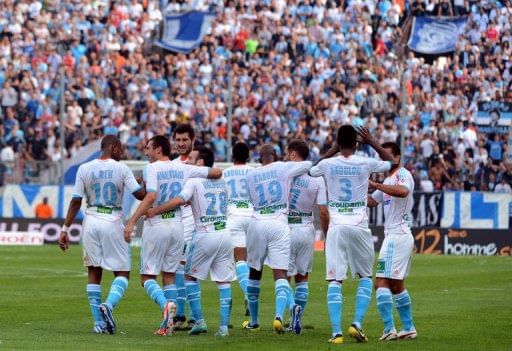 Marseille’s players congratulate teammate Morgan Amalfitano (2nd L) after scoring a goal during their French Ligue 1 match against Evian at the Velodrome stadium in Marseille, southern France, on September 23. Marseille host PSG next, in the latest installment of French football’s stormiest rivalry, on Sunday.