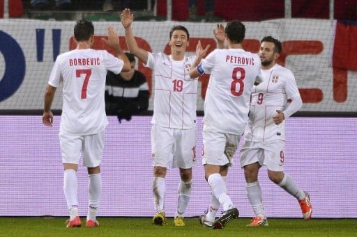 Filip Duricic (centre) celebrates Serbia’s third goal against Chile in St Gallen in November. Serbia fans have been banned from attending tonight’s match — and Croatia supporters for the return leg in Belgrade on September 6 — following an agreement between the two countries’ football federations to curb crowd trouble.
