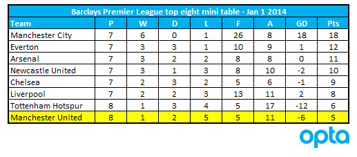 Not just on the overall table, but in the European candidates’ mini-league, too, have Manchester United faltered, claiming just five points from eight games against their direct rivals, despite the fact that five of those games were played at Old Trafford. No one is calling for Moyes’ head yet, but there is growing clamour from a fan base that is learning to support a club missing its ‘winning mentality’.