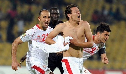 Tunisia midfielder Youssef Msakni (C) celebrates after scoring during their Africa Cup of Nations match against Algeria on January 22, 2013. Tunisia’s not-so-secret weapon is Msakni, who kept his country in contention for a ticket to the last eight when scoring the 90th-minute winner over Algeria.