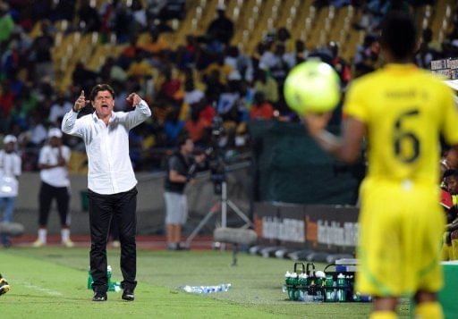 Togo coach Didier Six shouts during his side’s Africa Cup of Nations match against Algeria in Rustenburg on January 26, 2013. Six marvelled that Togo were still in contention for a quarter-finals place after their opening 2-1 loss to Ivory Coast and the victory over Algeria.