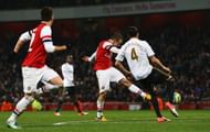 Szczesny played a ball out quickly, which fell to a Swansea player, but Jack Wilshere was quickest to react. He combines with Giroud, who cuts back to Ramsey, who himself cuts back, creates space and shoots ferociously into the net.