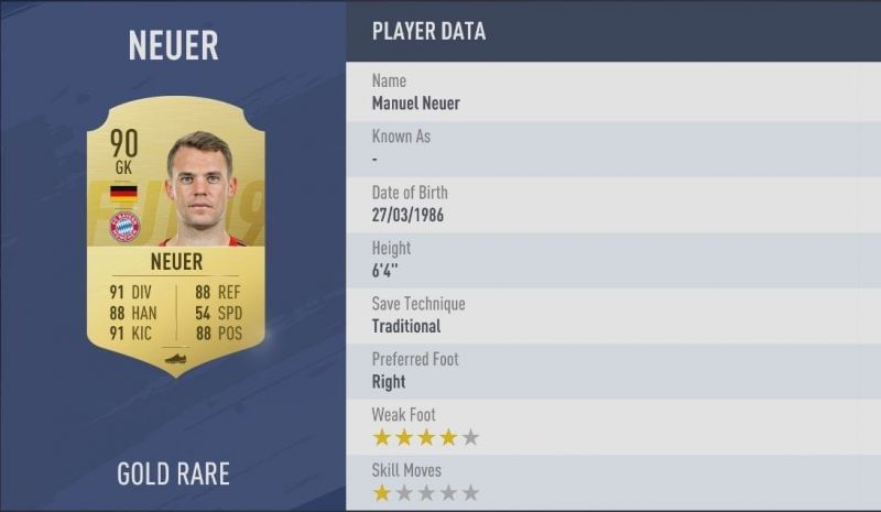 Neuer has the highest Diving and Kicking in the game with 91 each. He also has 88 Reflexes, Handling and Positioning. This makes him the best goalkeeper in the game except for one particular person. He can save almost any shot in the game. To beat him one has to hit particularly excellent shots. So forget about scoring if you are using a mid-table team against Neuer.