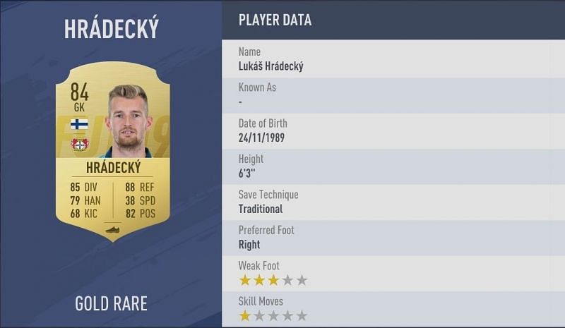 EA has awarded Hradecky justly for his amazing performances. His rating was bumped up by 1 from FIFA 18. The Finish international boasts an amazing 88 reflexes and 85 diving. These statistics enable him to save almost any shot that is close to his body. The 79 handling, however, means he will deflect a lot of balls which might give your opponents easy rebounds.