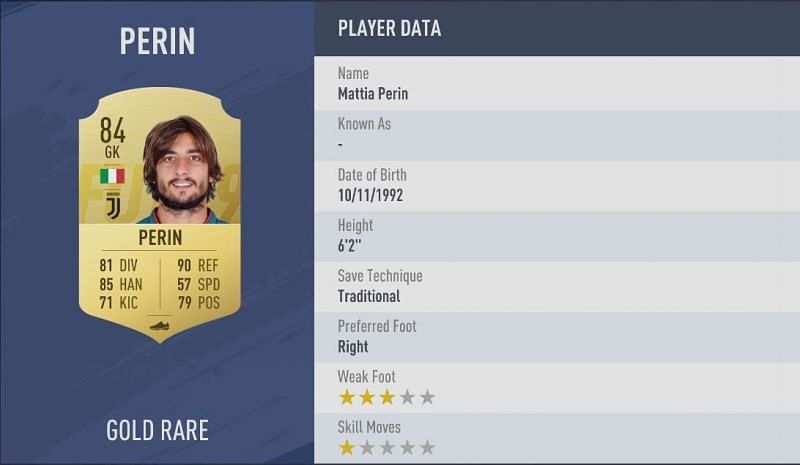 Perin kept his 84 rating from FIFA 18. As you can see, the best thing about his card is his incredible 90 reflexes. This is a visual treat for eyes as he literally flies all over the place saving shots. An 85 handling means he holds on to most shots as well. The diving and positioning deficit is bad, but the reflexes more than make up for it.