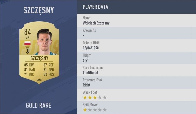 Towering at 6 feet and 5 inches tall, Sczesny is an imposing figure to have between the sticks. He has amazing reflexes and diving, 87 and 85 respectively. He will save most shots from short to medium distance. A low handling means he will spill a lot of the shots giving easy rebound opportunities. His positioning also leaves him vulnerable to finesse shots.