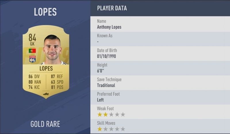 Olympique Lyonnais keeper Anthony Lopes is the next man on the list. Out of all the 84 rated keepers, Lopes has the highest total In-Game Stats, thus his placing above all the other 84 rated keepers. One of the only goalkeepers with a 'One Club Player' trait, Lopes has been with Lyon his entire career.