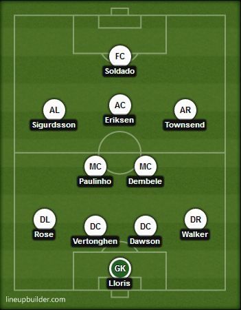 The starting line-up has very little weaknesses and it is a very offensive one. Paulinho may start as the defensive midfielder, but as he showed against Cardiff last weekend, he is capable of scoring goals as well. Thinking very hard, one may say that Danny Rose is a weak link given his lack of experience.