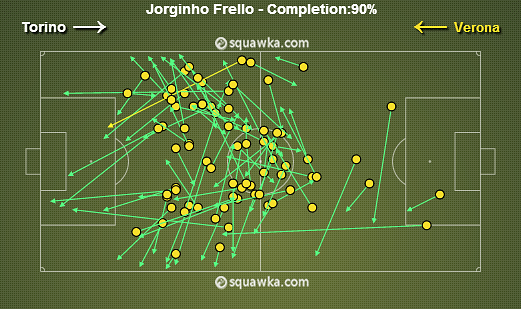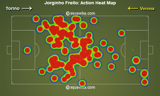 In Verona’s recent 2-2 draw with Torino, Jorginho showed up all over the pitch; his heat map is one of the best you could come across.