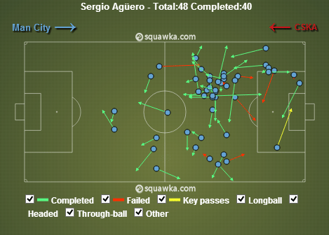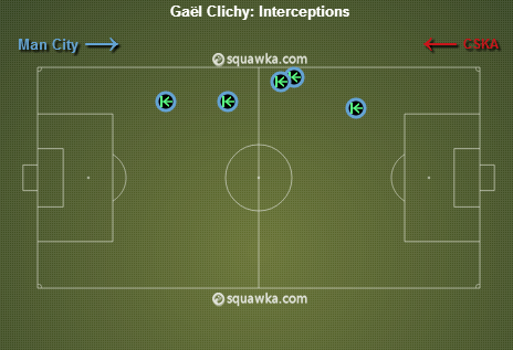 It was highlighted prior to the match that one of CSKA’s main threats to Manchester City’s defence was Zoran Tosic, his threat was expertly nullified by Clichy. The former-Arsenal defender made five interceptions, and as you can see below, all five where on the right-hand side of CSKA’s midfield – in the exact position where Tosic was positioned. As a result, Tosic was given a performance score of -29 and only completed 77% of his attempted passes. Travail fait as they say in France.