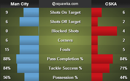 Manchester City’s complete dominance over CSKA is evident in the majority of the key stats from the game. Firstly, the amount of shots City had on target (9) shows exactly why the English side scored five goals, which led them to such a prominent victory. Secondly, City’s clear domination over possession is the other reason to show Man City’s control over the Russian side. City had 56% possession of the ball, which equates to a huge 616 completed passes on the night – this, in European football is almost unheard of.