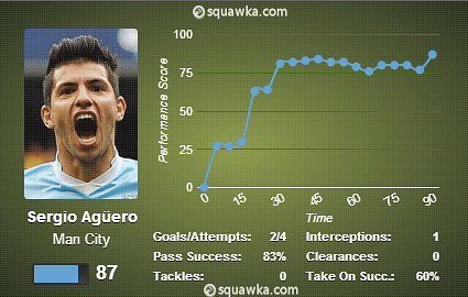 The Man of the Match award was always going to be a competition between strike duo Alvaro Negredo and Sergio Aguero. Using our Performance Score data, the Argentine just pips his team-mate take the Squawka Man of the Match award.