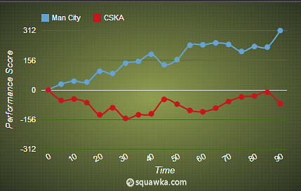 The performance score from Man City’s 5-2 win once again shows exactly why City won by a comfortable margin. As you can see, Manuel Pellegrini dominated from the first to the final minute, this is shown by as the game continued, the two lines that show each team’s performance score became wider and wider.