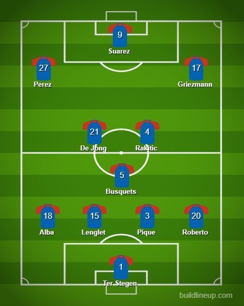 Barcelona: Marc-Andre Ter Stegen, Sergi Roberto, Gerard Pique, Clement Lenglet, Jordi Alba, Sergio Busquets, Frenkie De Jong, Ivan Rakitic, Antoine Griezmann, Carlos Perez, Luis Suarez.