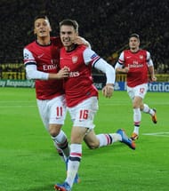 (R) Aaron Ramsey celebrates scoring Arsenal’s goal with (L) Mesut Ozil during the UEFA Champions League Group F match between Borussia Dortmund and Arsenal at Signal Iduna Park