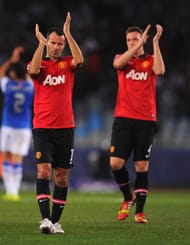 Ryan Giggs and Phil Jones of Manchester United applaud the travelling Manchester United fans at the end of the UEFA Champions League Group A match between Real Sociedad and Manchester United at Estadio Anoeta