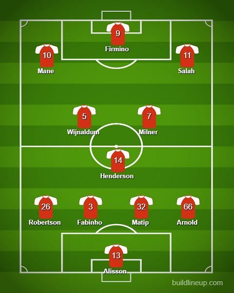 Liverpool: Alisson Becker, Trent Alexander-Arnold, Joel Matip, Virgil Van Dijk, Andy Robertson, Fabinho, James Milner, Georginio Wijnaldum, Mohamed Salah, Sadio Mane, Roberto Firmino.