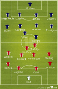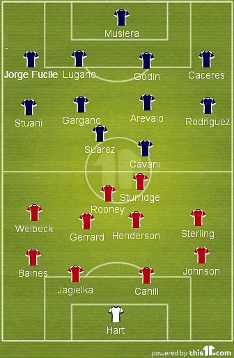 Uruguay: (4-4-2): Fernando Muslera, Maximiliano Pereira, Diego Lugano, Diego Godin, Martin Caceres, Cristhian Stuani, Egidio Arevalo Rios, Walter Gargano, Cristian Rodriguez, Luis Suarez, Edinson Cavani
