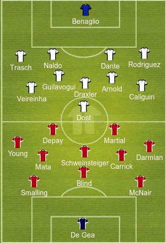 Manchester United (3-5-2): De Gea; McNair, Smalling, Blind; Young, Carrick, Schweinsteiger, Mata, Darmian; Depay, Martial.