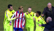 Last night’s bad-tempered Copa del Rey clash between Atletico Madrid and Barcelona saw the two sets of players square-off while they were walking off the pitch at half-time. The incident-ridden match saw the visitors Barcelona defeat the hosts Atletico 3-2, enabling them to go through to the semi-finals 4-2 on aggregate.