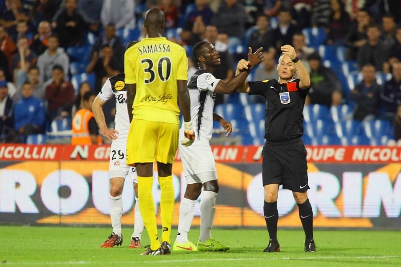 The incident happened during a Ligue 1 match between Guingamp and Montpellier on Saturday when the referee was reaching for his red card to send Samassa off in the 89th minute for making a forceful protest. Seeing this, Angoua decided to intervene, and attempted to snatch the red card away from Kalt.