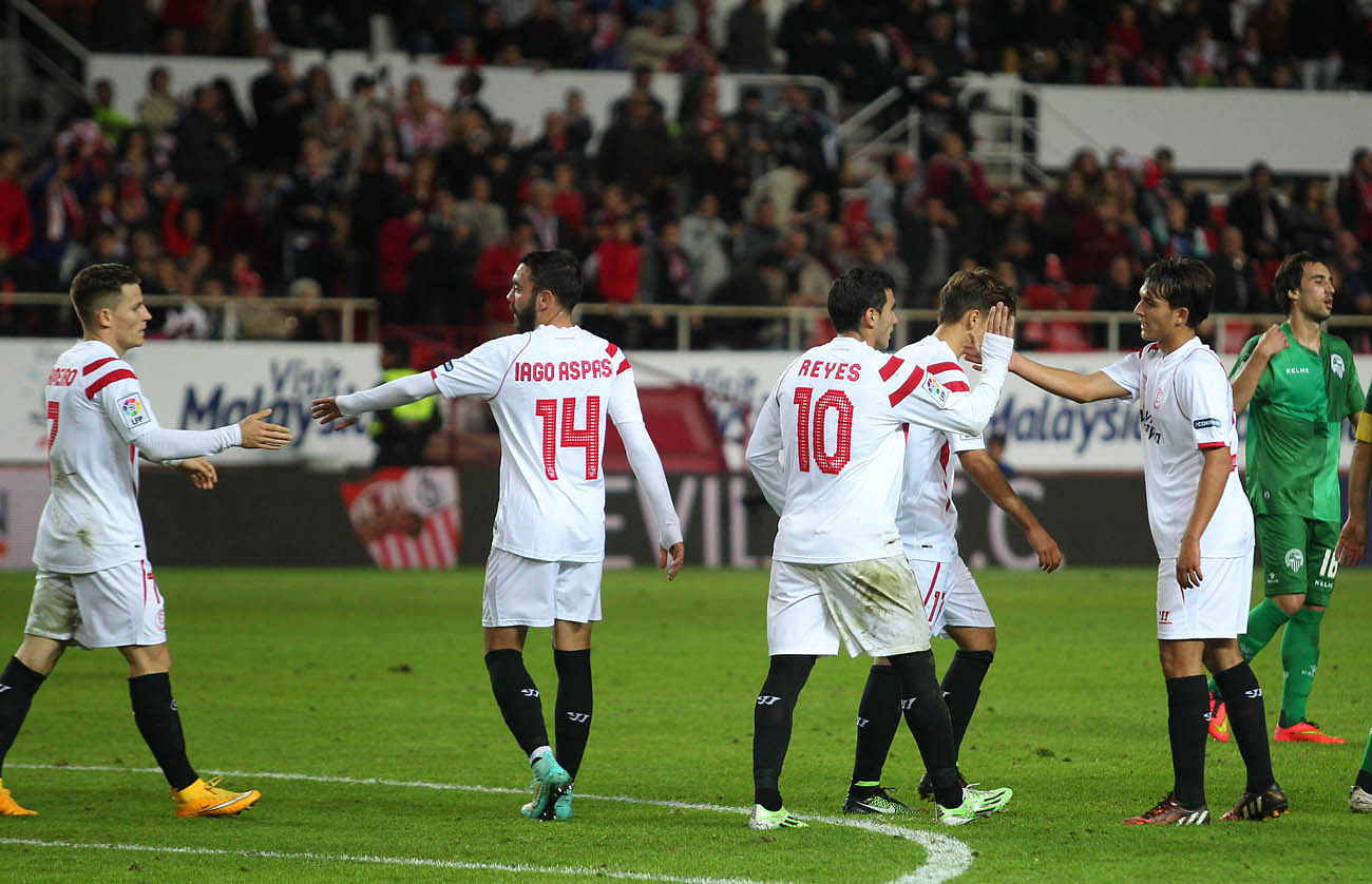 Sevilla moved into the next round of Copa del Rey as they registered a thumping 11-2 aggregate win over Sabadell, thanks to a quick-fire hat-trick from Liverpool loanee Iago Aspas who scored three times in the period of just four minutes.