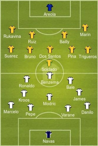 Real Madrid (4-3-3): Navas, Marcelo, Pepe, Nacho, Danilo, Kroos, Modric, James, Ronaldo, Benzema, Bale.