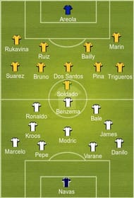 Villareal (4-5-1): Areola, Marin, Bailly, Ruiz, Rukavina, Suarez, Bruno, Pina, Trigueros, Dos Santos, Soldado