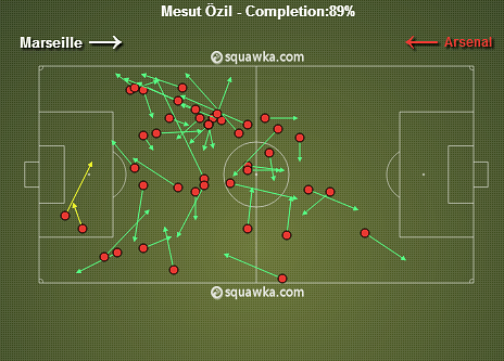 Ozil will be looking to improve upon the last time he played Marseille, when he was a marked man every time he received the ball. Whilst he did contribute two key passes from inside the box, Ozil ‘s pass map (shown above) shows that he frequently resorted to dropping deep or into wide areas to pick up the ball, with very few forward passes made from central positions.