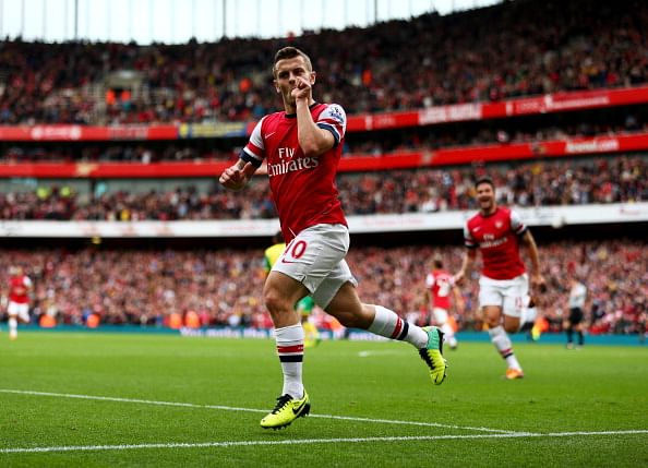 LONDON, ENGLAND – OCTOBER 19: Jack Wilshere of Arsenal celebrates as he scores their first goal during the Barclays Premier League match between Arsenal and Norwich City at Emirates Stadium on October 19, 2013 in London, England. (Photo by Paul Gilham/Getty Images)