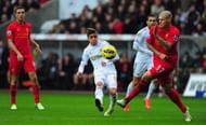 SWANSEA, WALES – NOVEMBER 25: Swansea forward Pablo Hernandez (c) has a shot at goal during the Barclays Premier League match between Swansea City and Liverpool at Liberty Stadium on November 25, 2012 in Swansea, Wales.