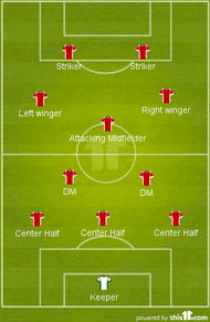 This in fact is a defensive formation with 5 defenders in the side as this formation is actually a 5-3-2. In this formation the most important players are the defensive midfielder and the central center half. The central center half is actually a sweeper who should also be able to support the midfield. A player like Mats Hummels is the most suitable one for this position. No wonder why Van Gaal wanted him badly.