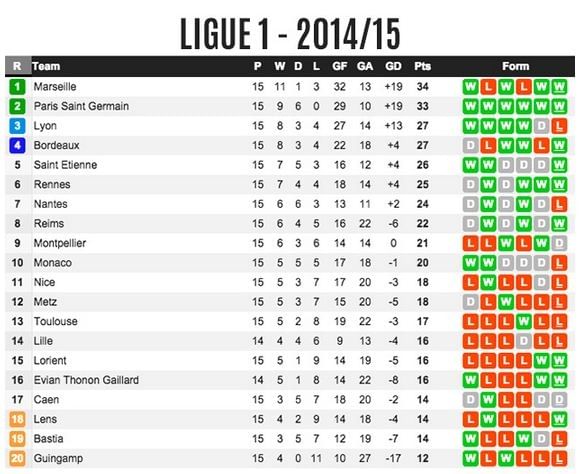 The recent Willy Sagnol controversy has perhaps overshadowed Bordeaux’s good work, but their win over Lille – all but out of the picture, stuck in 14th and the league’s lowest scorers with a meagre 9 – on Sunday took them level on points with Lyon. They won praise from Sagnol for their “best defensive performance of the season”, and extended their current run to 4 wins in 5. Cheick Diabaté’s winner was his 6th of the season, but he is ably supported by Diego Rolán (5) and Wahbi Khazri (4).