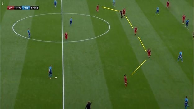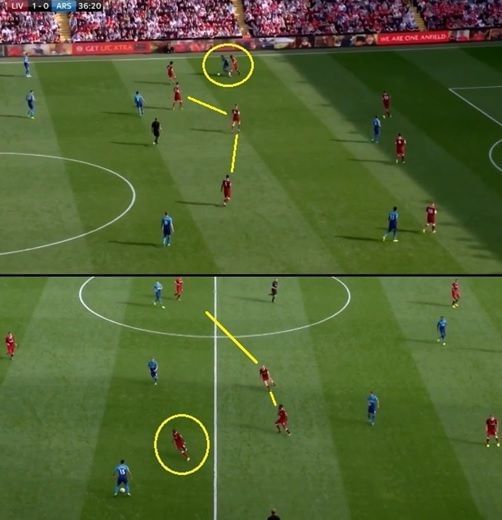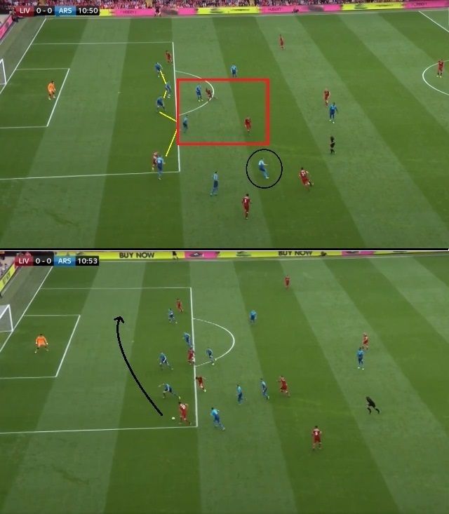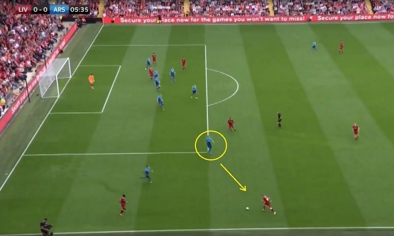 This was the major difference between Arsenal and Liverpool as whenever Gomez or Moreno received the ball, neither of Bellerin and Oxlade-Chamberlain closed them down out of fear of leaving Salah and Mane with their back three. Hence entire back five of Arsenal were occupied by just 3 Liverpool attackers and it only increased the defensive load on Xhaka, Ramsey, Sanchez and Ozil.