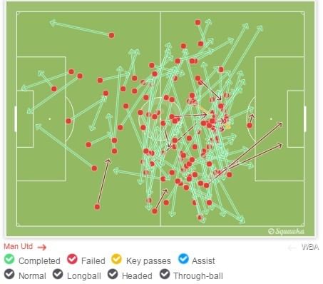 Compare the above to Carrick’s most recent performance against West Brom and you can clearly see the difference in the number of passes that he completed in the opposition half and that too a majority of forward passes.